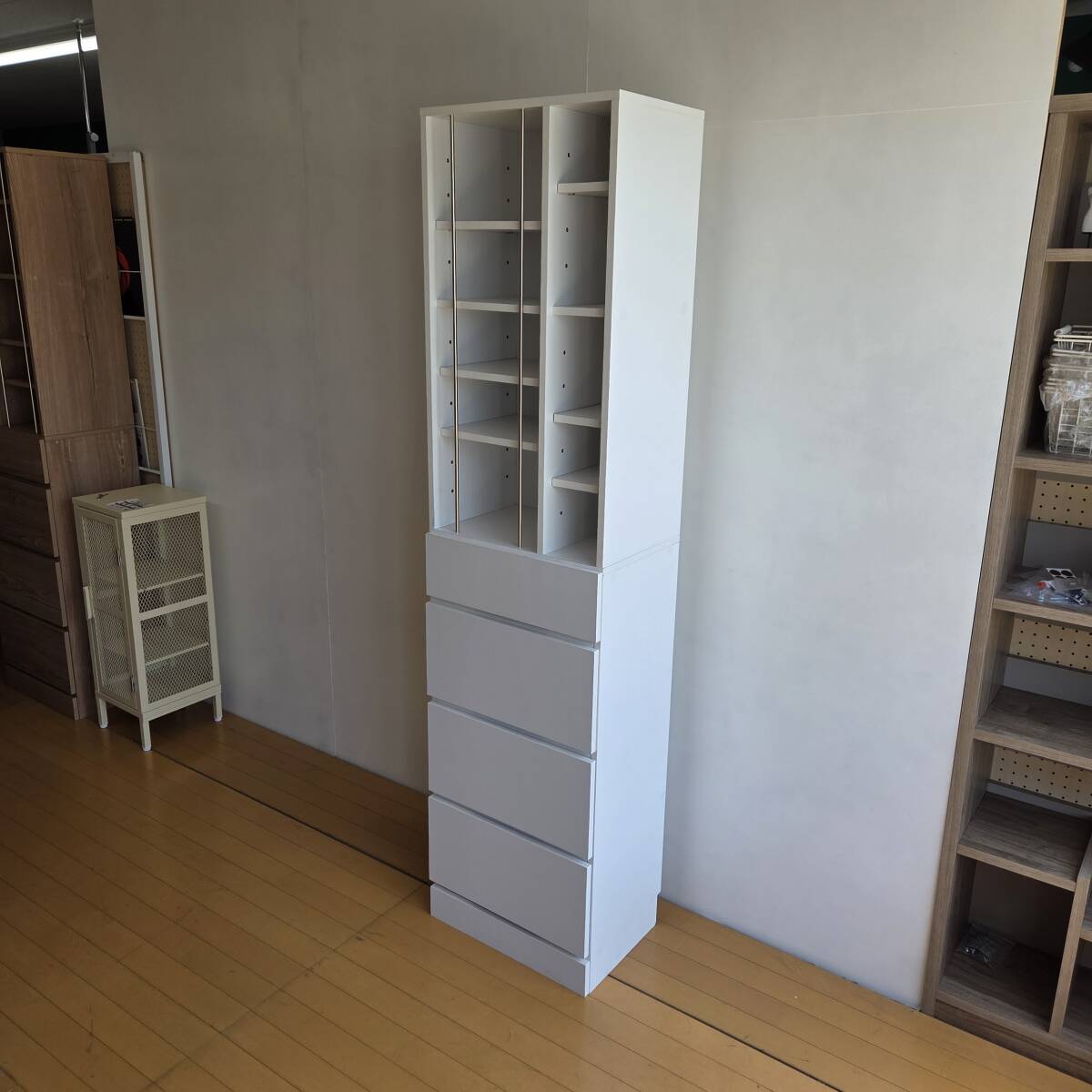 - 未使用訳あり ランドリーチェスト 幅45.5 奥行32 高さ180 ホワイト ハイグロス 省スペース 洗面所 ランドリー オープン棚 引出 チェスト