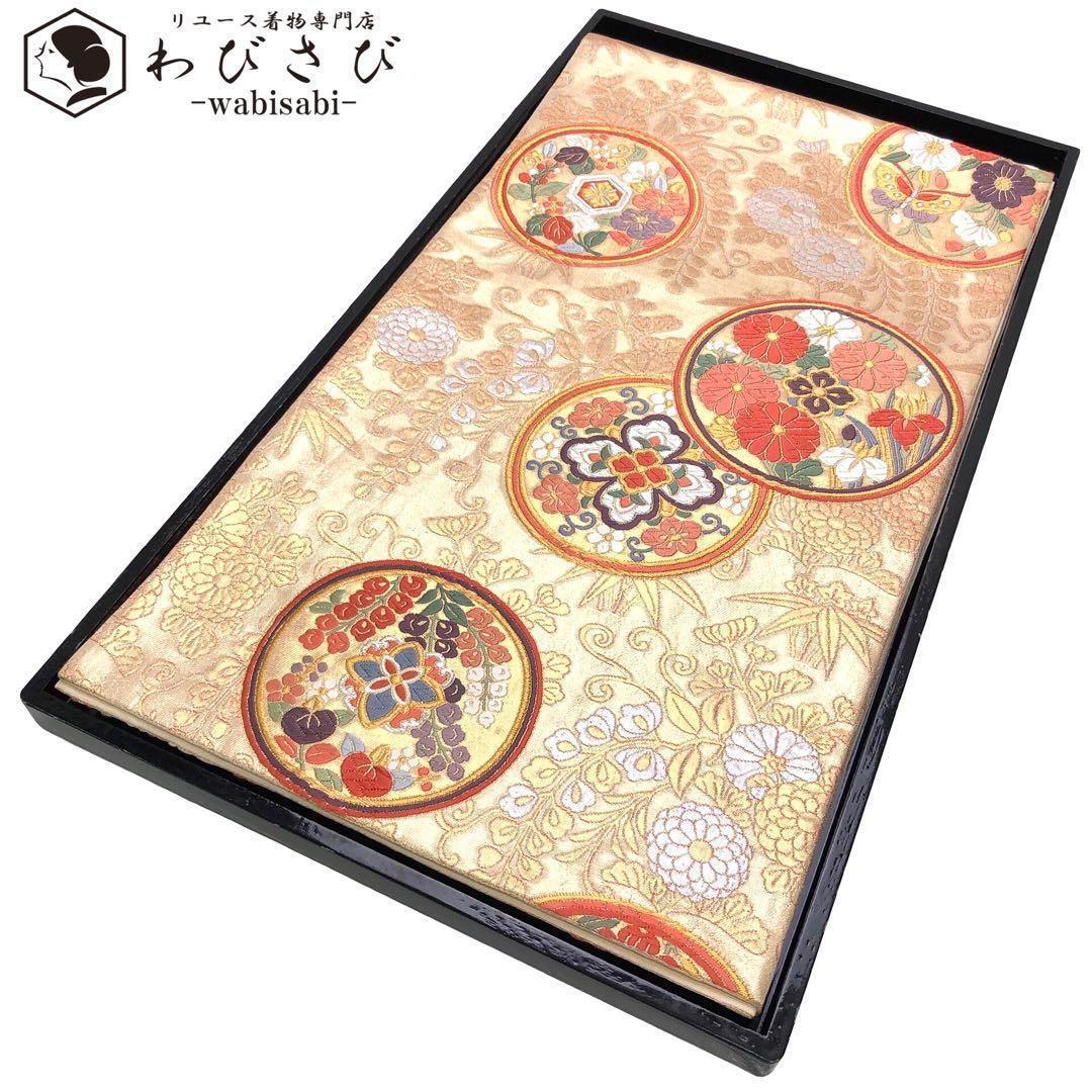 > 袋帯 丸の中に鮮やかな花模様 金銀糸 金色 O-3184 着物 きもの kimono 和服 和装 中古 リサイクル着物 【送料無料】