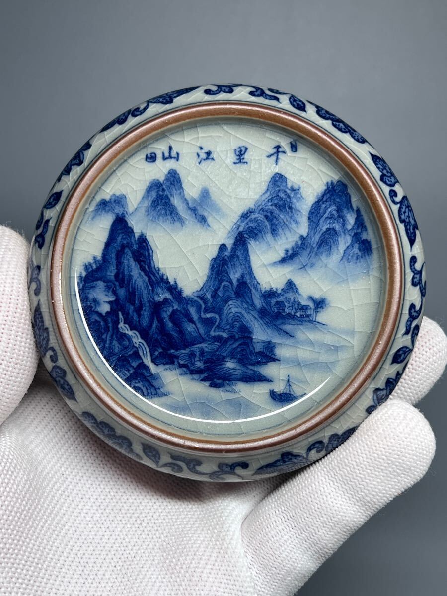 - 中国景徳鎮 茶道具 蓋置 蓋托 杯托 青花山水纏枝紋 手絵 唐物