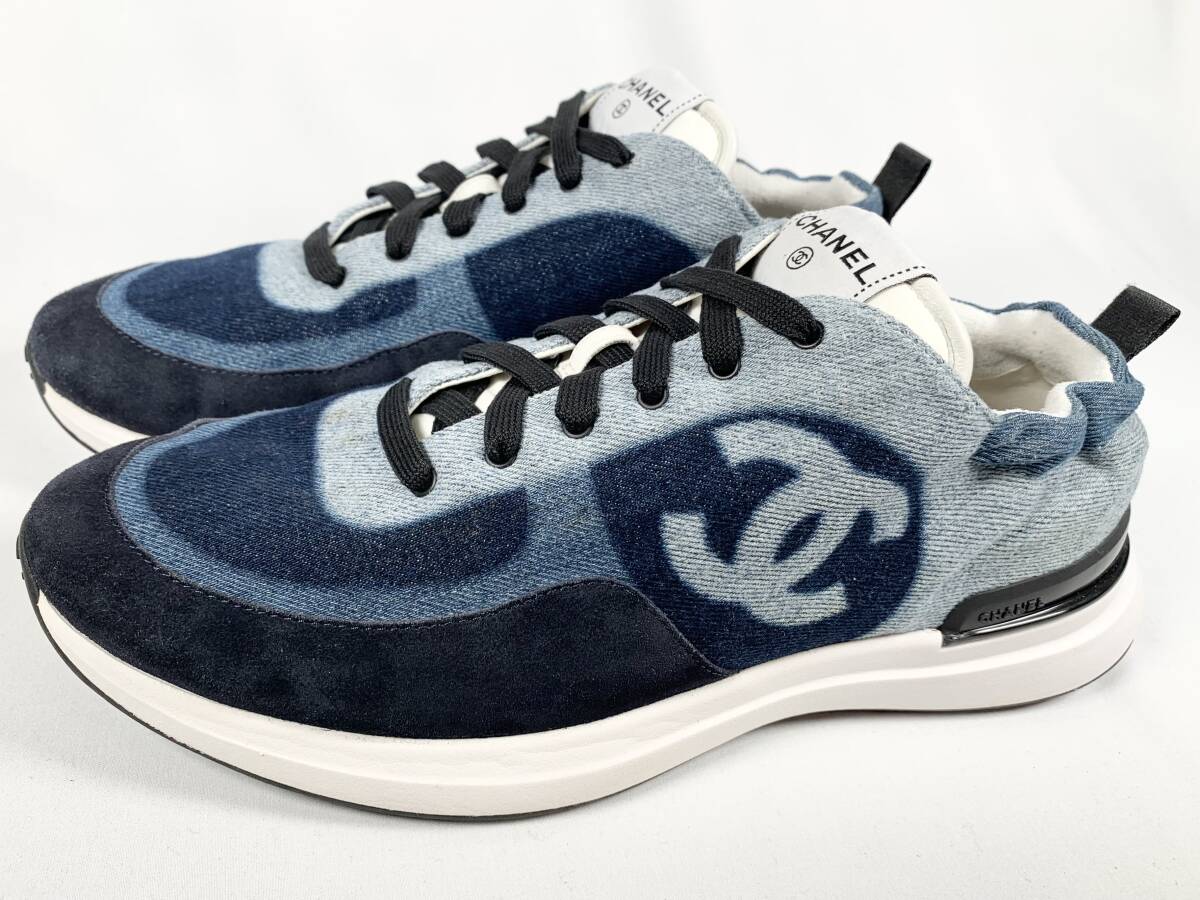 > 【正規品】ほぼ未使用 シャネル CHANEL G37495 ココマーク CC デニム レザー スエード スニーカー メンズ 靴 43 青 ブルー インディゴ