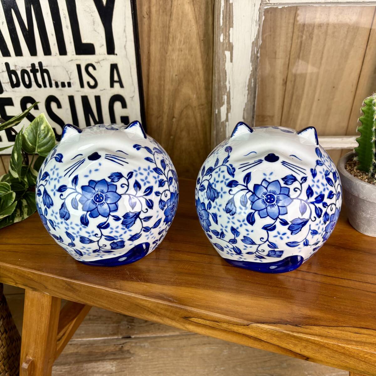 - 染付陶器、猫貯金箱置物2点セット、置物、インテリア雑貨、ねこ、陶器、アジアンエスニック、和室、インテリア小物、ガーデン小物