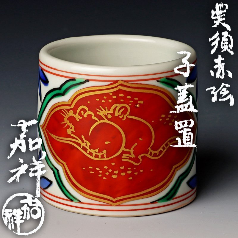 - ★【古美味】森岡嘉祥 呉須赤絵子蓋置 茶道具 保証品 u9YG