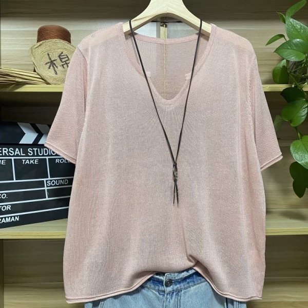 > 25zy サマーニット トップス 高質 ラフ 麻タッチニット チュニック ナチュラル 麻混 サラサラ 涼感 Vネック オフピンク