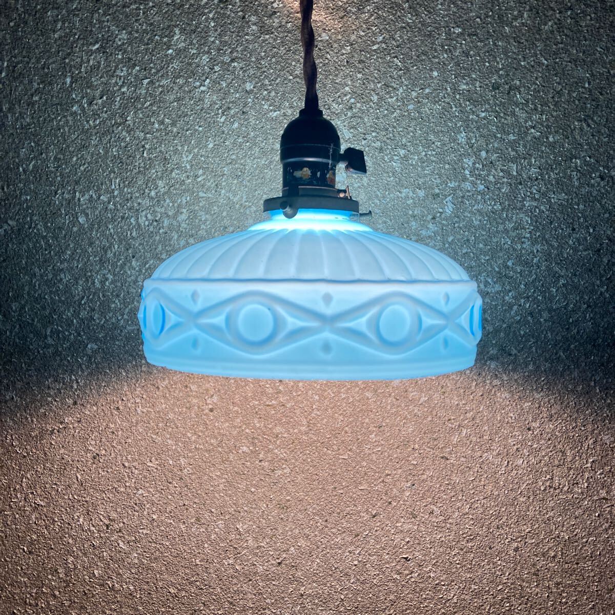 - 大正時代昭和時代初期頃のレトロな照明.笠の内らは乳白色で外は薄いブルー色.切子模様.重さ約1kg.全て純正品.稼働品.電球付き.当時物.完品.