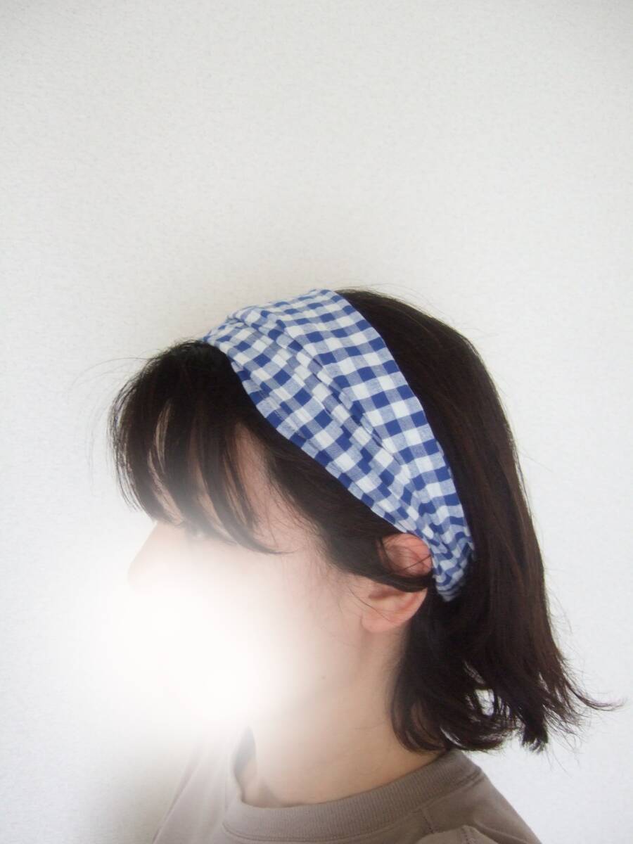 - ★即決★ハンドメイド 爽やかブルーギンガムチェック サッカーコットンのゆるターバン**ヘアバンド 汗止めに 首元涼しく