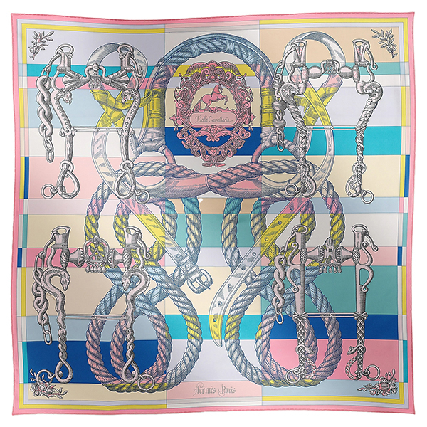 > エルメス カレ 90 ダブルフェイス デッラ カヴァッレリア スカーフ シルク ローズボンボン ブルー イエロー 4082