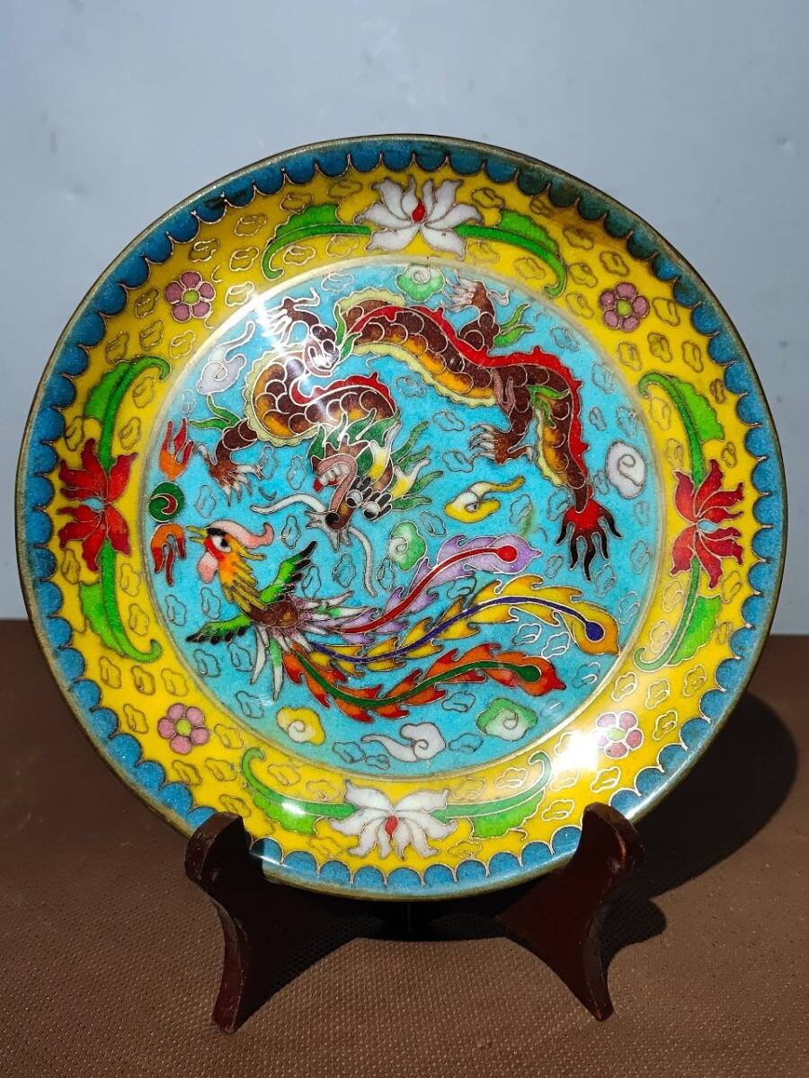 - ▽鴻▽ 銅製 景泰藍 琺瑯彩 龍鳳呈祥紋 賞盤 置物 賞物 古賞物 古董品 時代物 稀少珍品 中国古玩 中国古美術