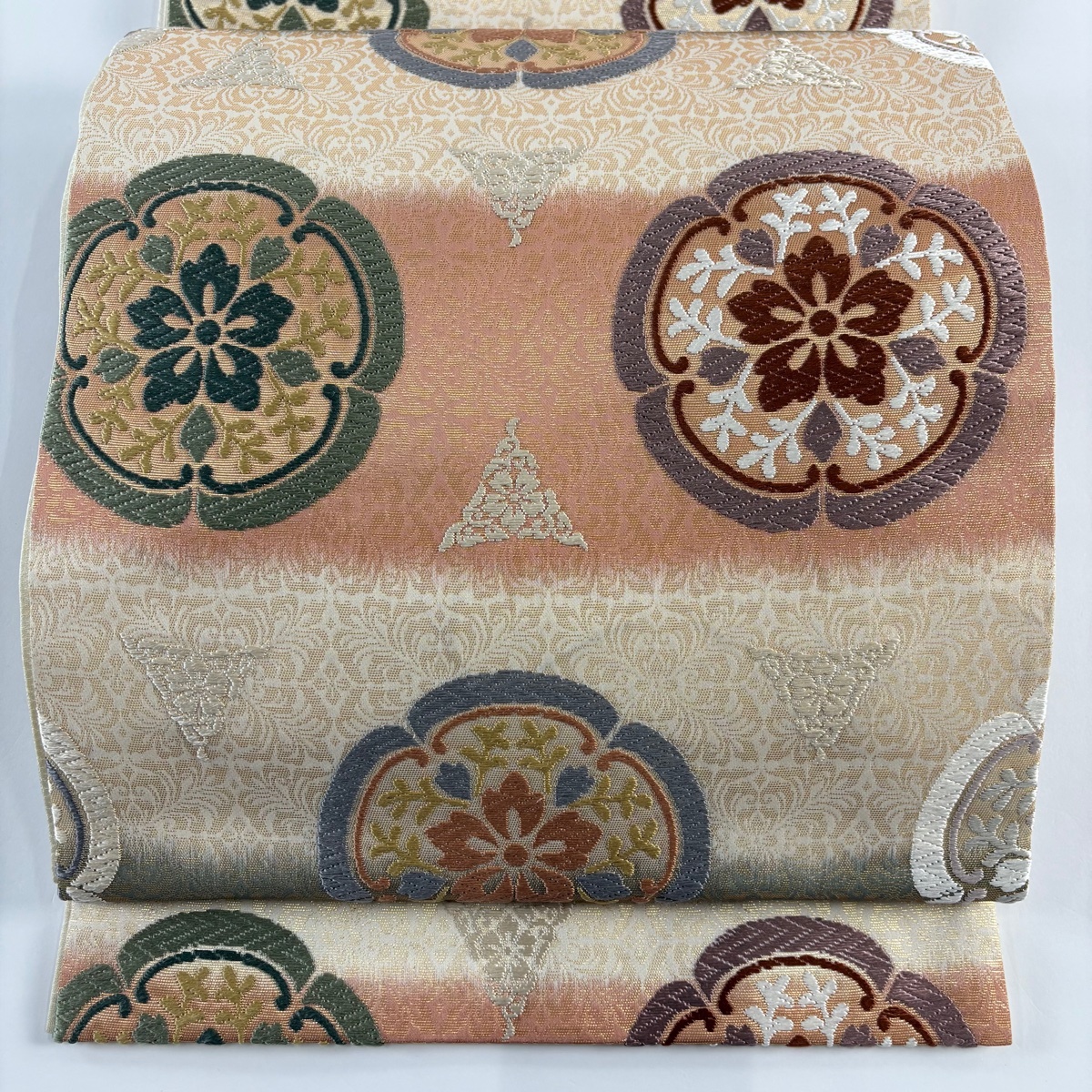 > 【在庫一掃】 袋帯 名品 能衣唐草華文 唐織 箔 ベージュ 六通 正絹 【中古】