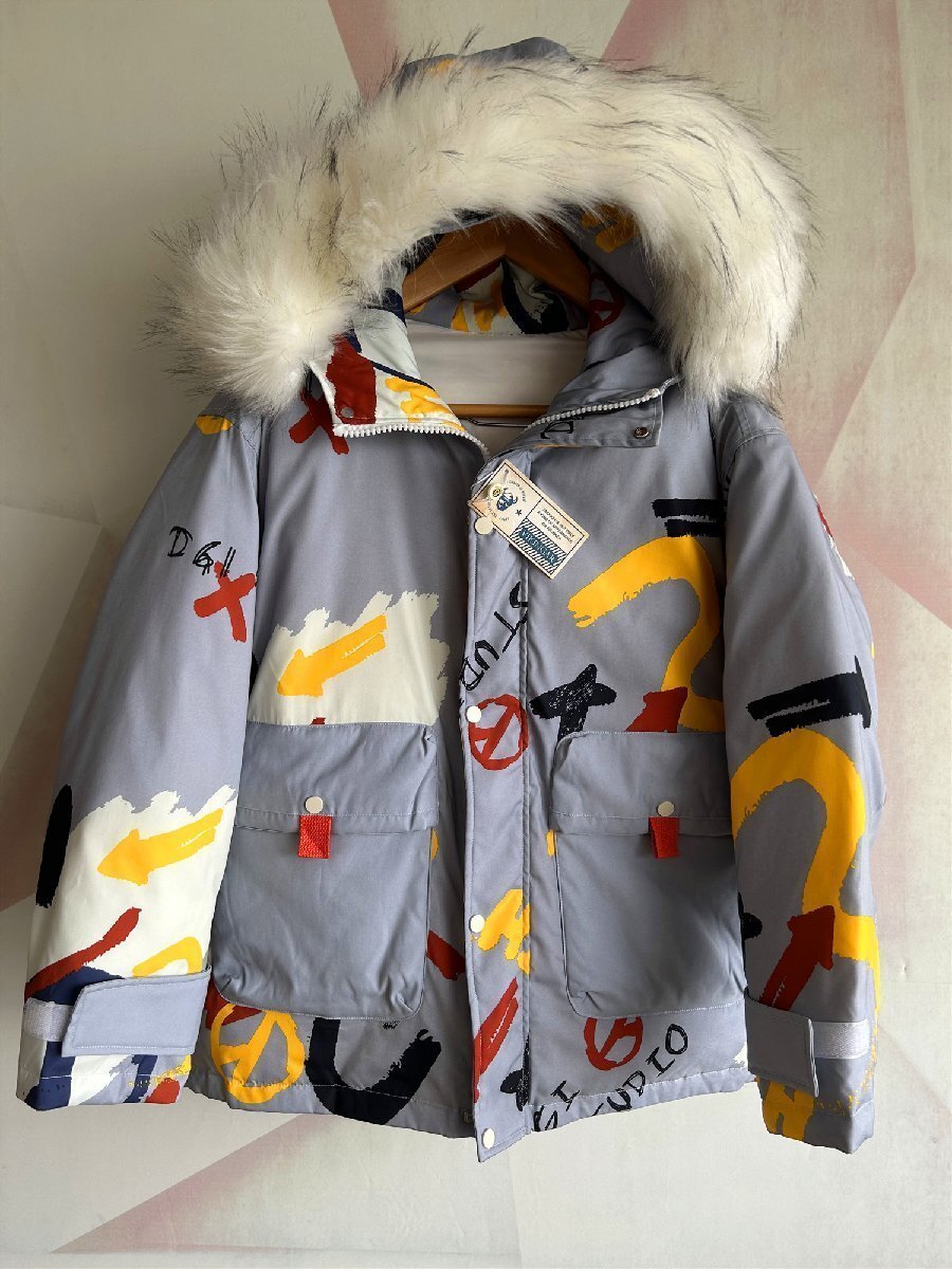 - YR-青/ 落書き【実寸S XS-S程度】最高級ライン 個性の溢れるパターン 肉厚 防寒防風 寒冷地 Ecoファー付 ファー脱着 高品質 贅沢 ダウ