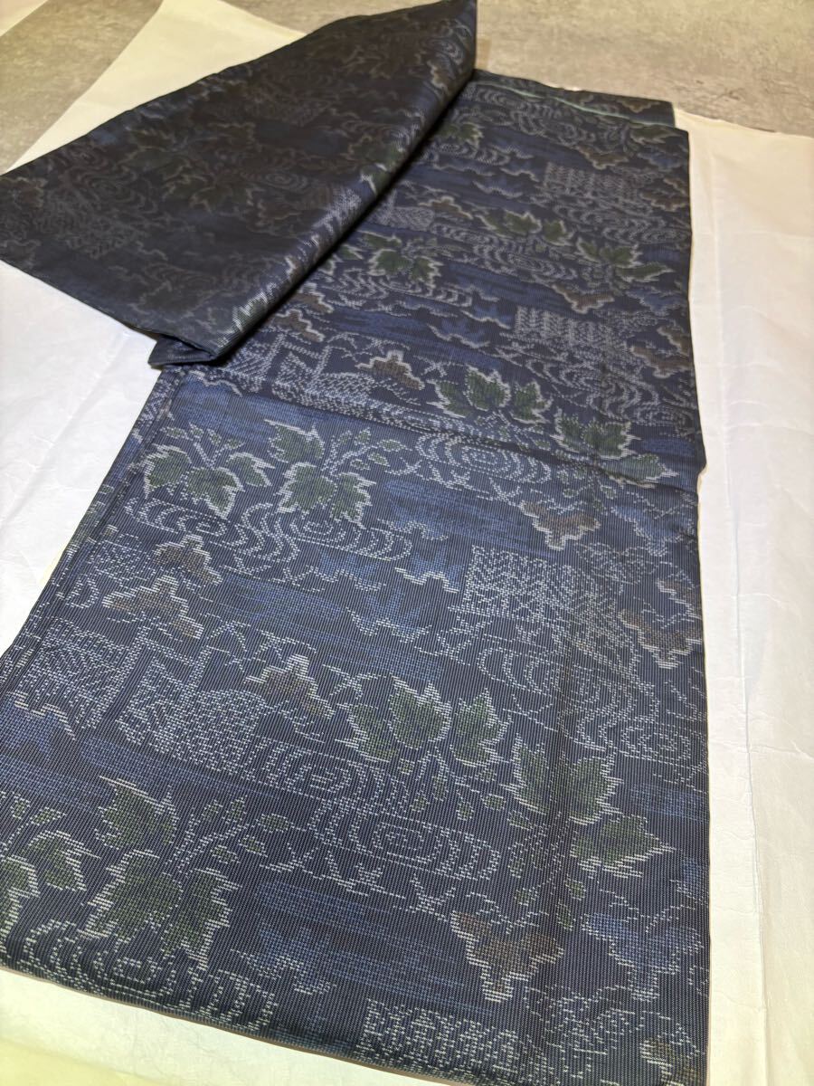 - 大島紬 正絹 薄模様 渦 桐 松 青灰色地 着物 和服 和装 リメイク 染め替え ハンドメイド 生地 衣装 百貨店 高級