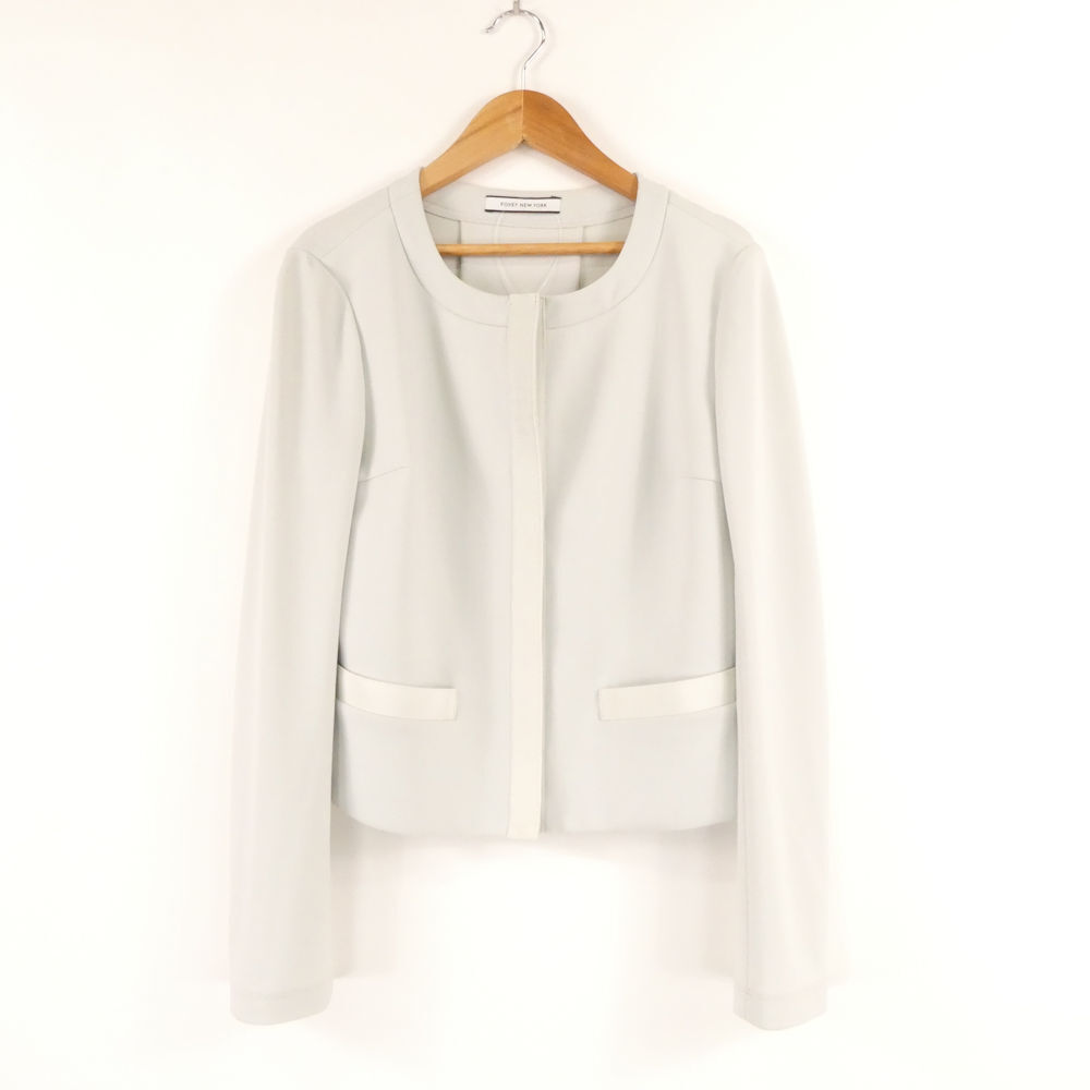 - FOXEY NEW YORK フォクシー 34100 ノーカラージャケット 38 Sサイズ相当 ポリエステル他 ブルー グレー レディース AD808A67