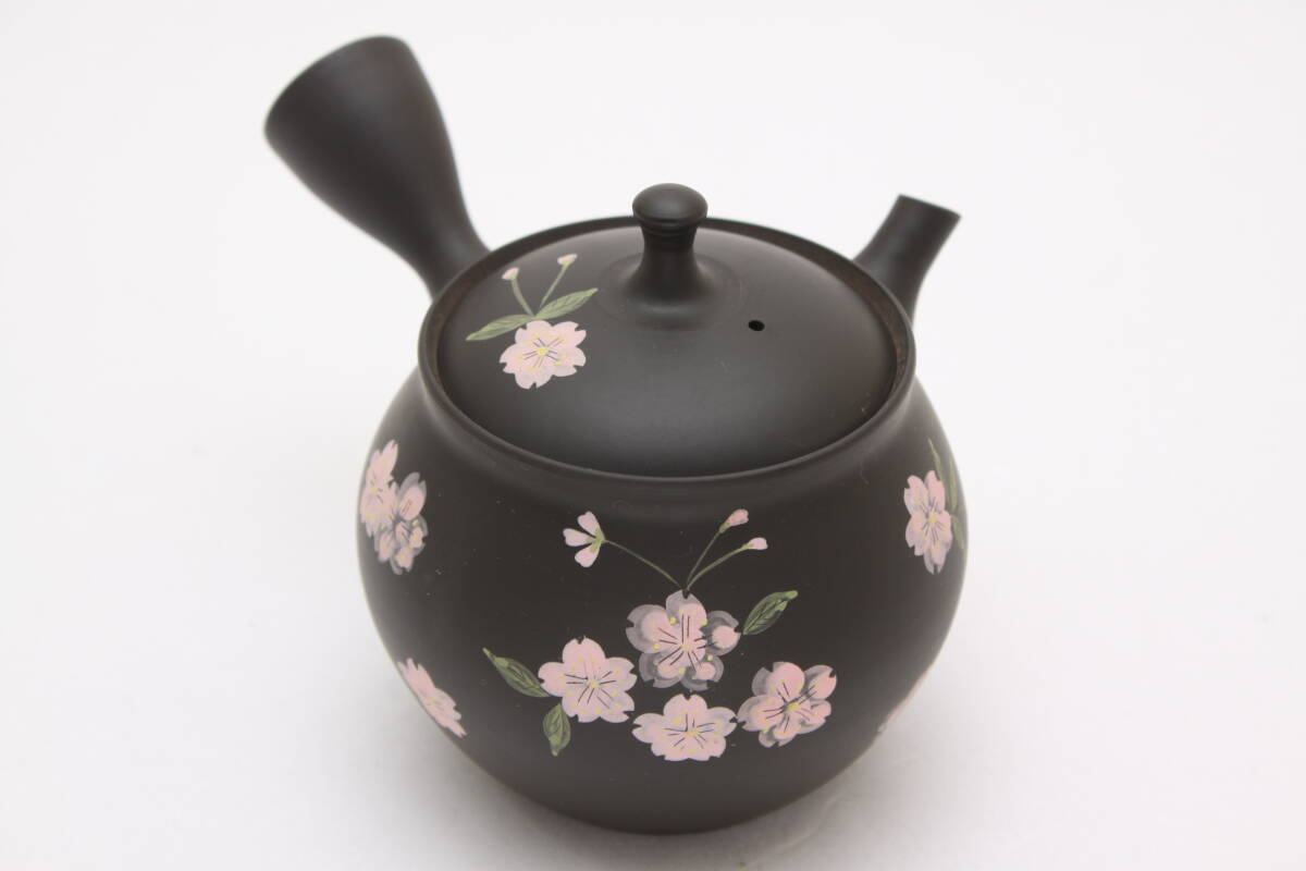 > 1055 新品未使用 常滑焼 人気作家 昭龍 梅原昭二 桜花画 黒マット 軽い135g 横手 急須 茶注 煎茶道具