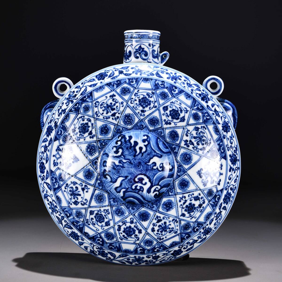 - 旧蔵 明 青花 雲錦紋 扁壺 陶芸 古陶磁器 中国磁器 極細工 中国古玩 骨董品 古美味 207