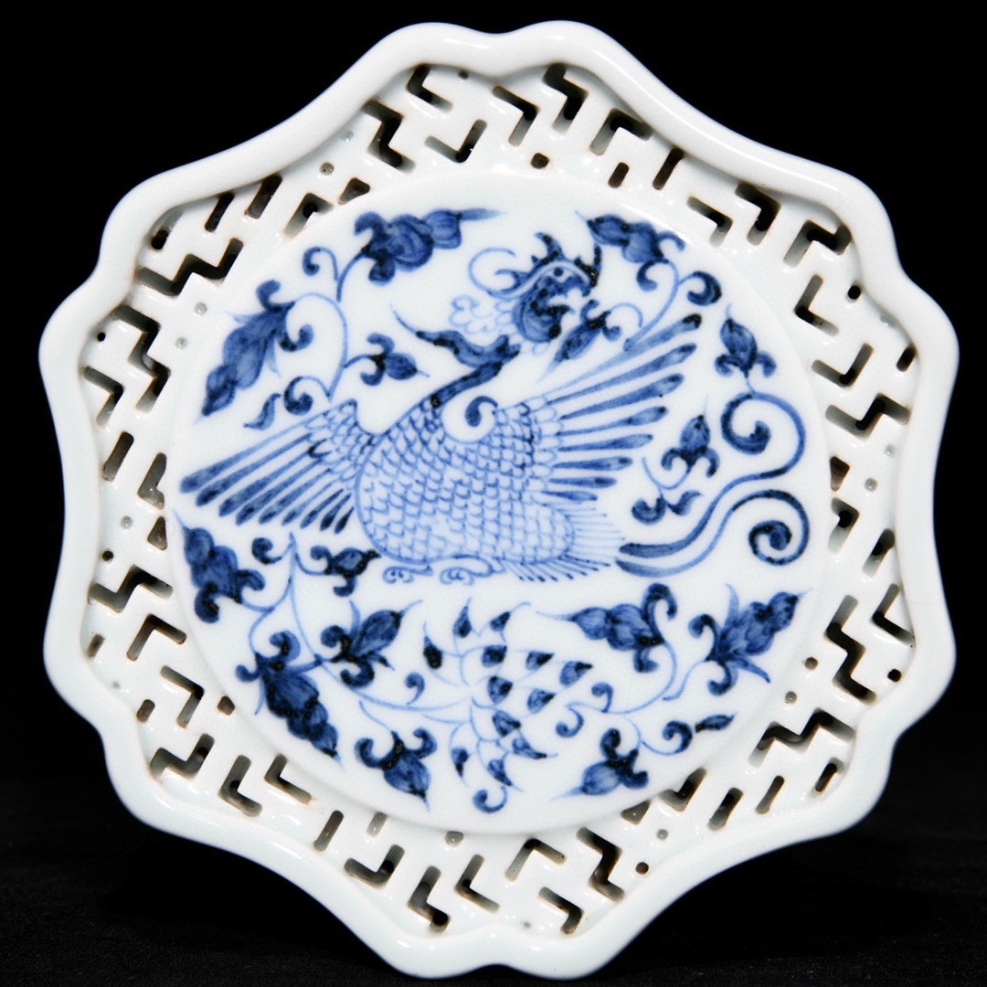- zz7|5145 中国磁器 陶芸 磁器『明青花鳳紋壺承』施釉陶 古代工芸品 陶芸 精美彫 置物 收藏品