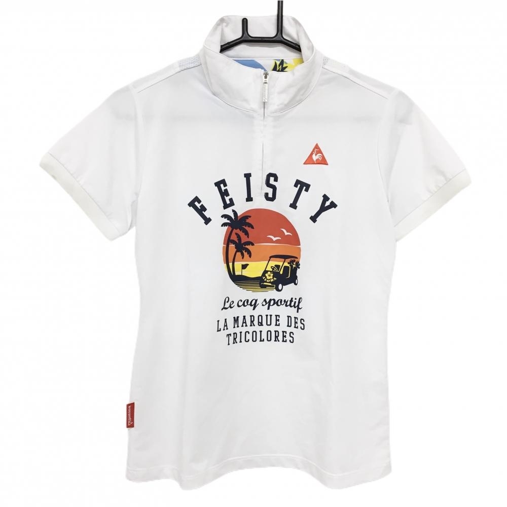 > 【美品】ルコックゴルフ 半袖ハイネックシャツ 白 フロント夕景プリント ハーフジップ レディース L ゴルフウェア le coq sportif