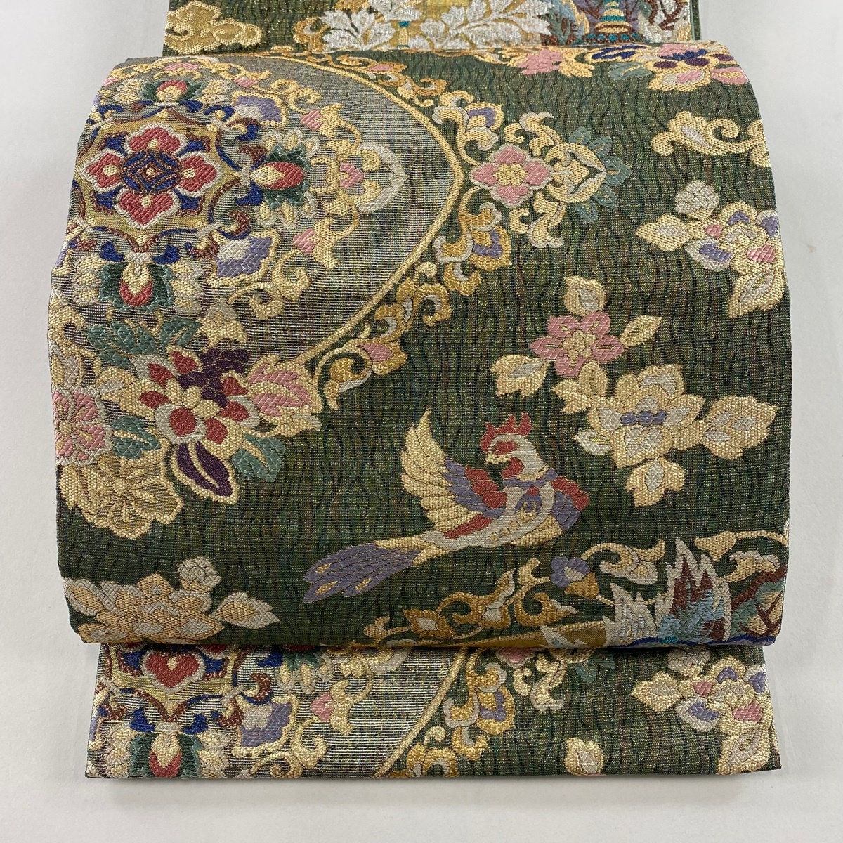 - 【在庫一掃】 袋帯 名品 建物 花鳥 金糸 箔 緑 六通 正絹 【中古】