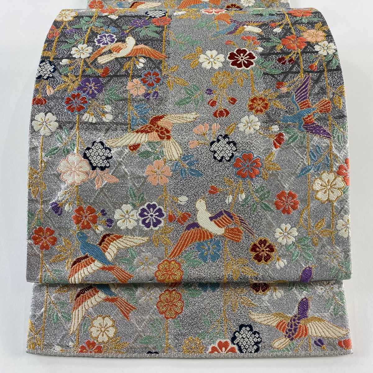 > 袋帯 秀品 関西仕立て 桜 鳥 刺繍 箔 銀色 六通 正絹 【中古】