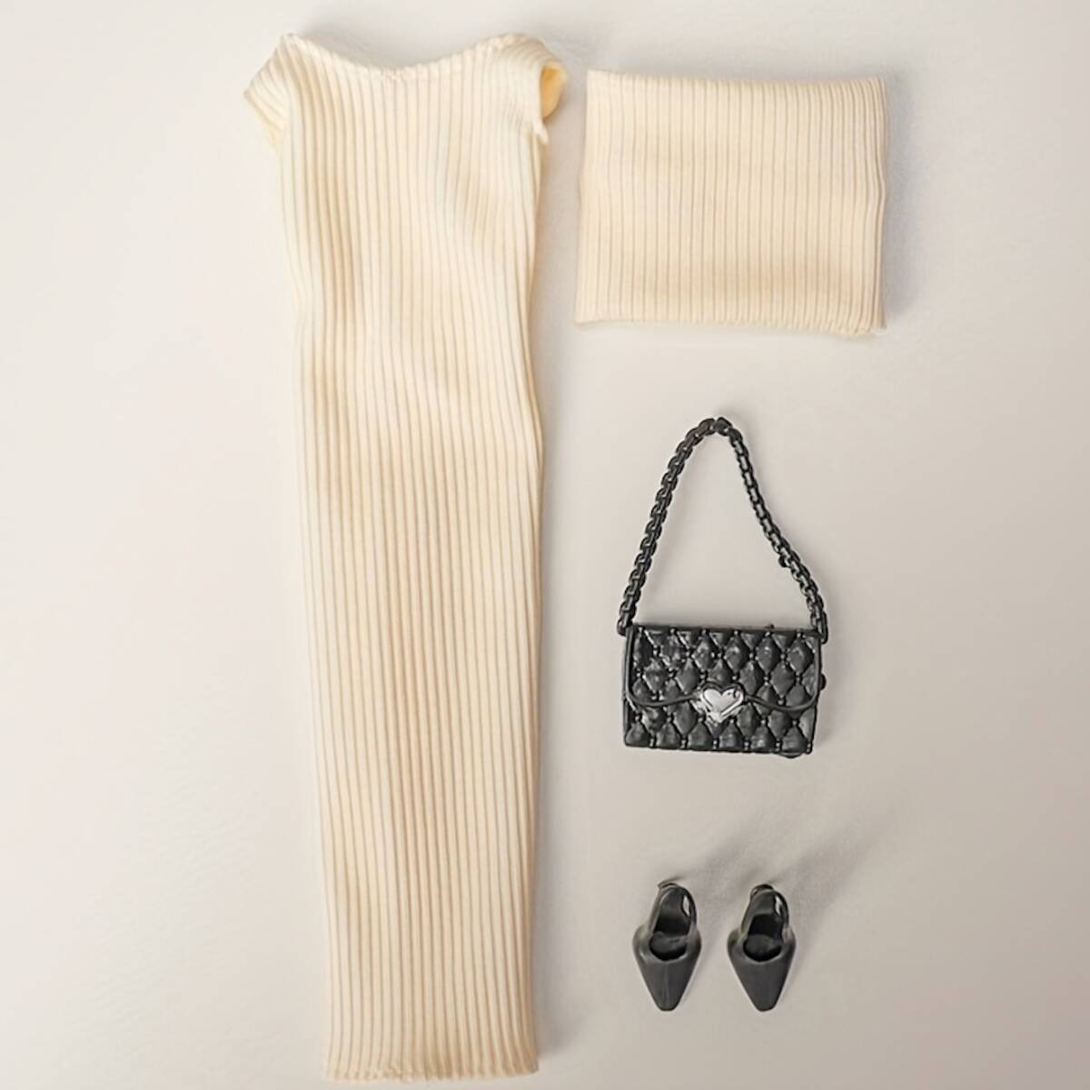 - 着せ替え人形 ニットワンピース 白 バッグ 靴 交換衣装 1/6スケール 女性 レディース かわいい おしゃれ バービー人形サイズ ドール t7402