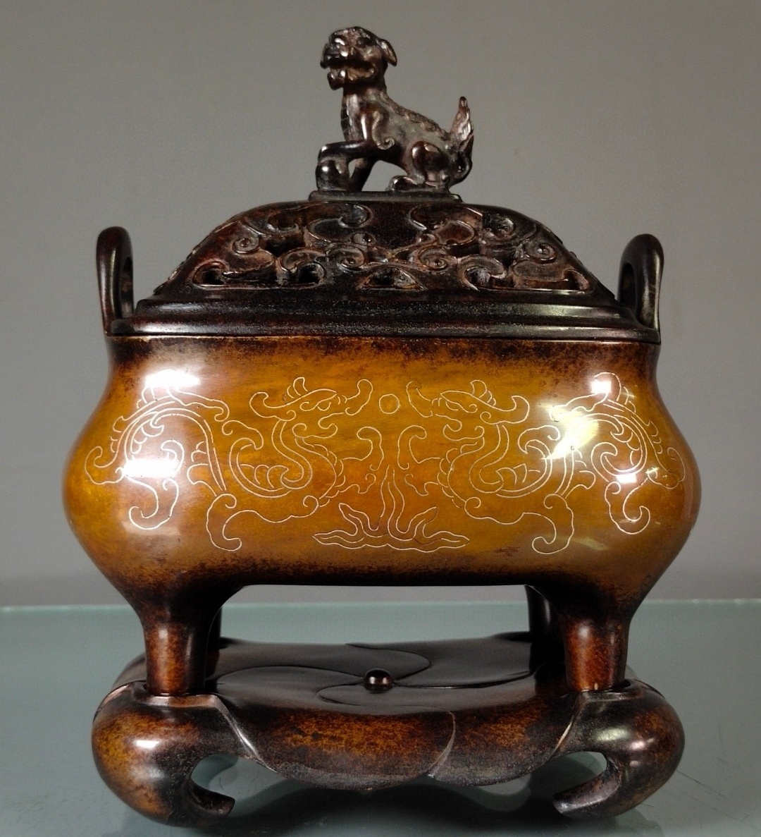 - 旧蔵 清 紫銅 手動モザイク銀糸 燻香炉 香道具 銅製 銅器 極細工 中国古玩 骨董品 古美味 207