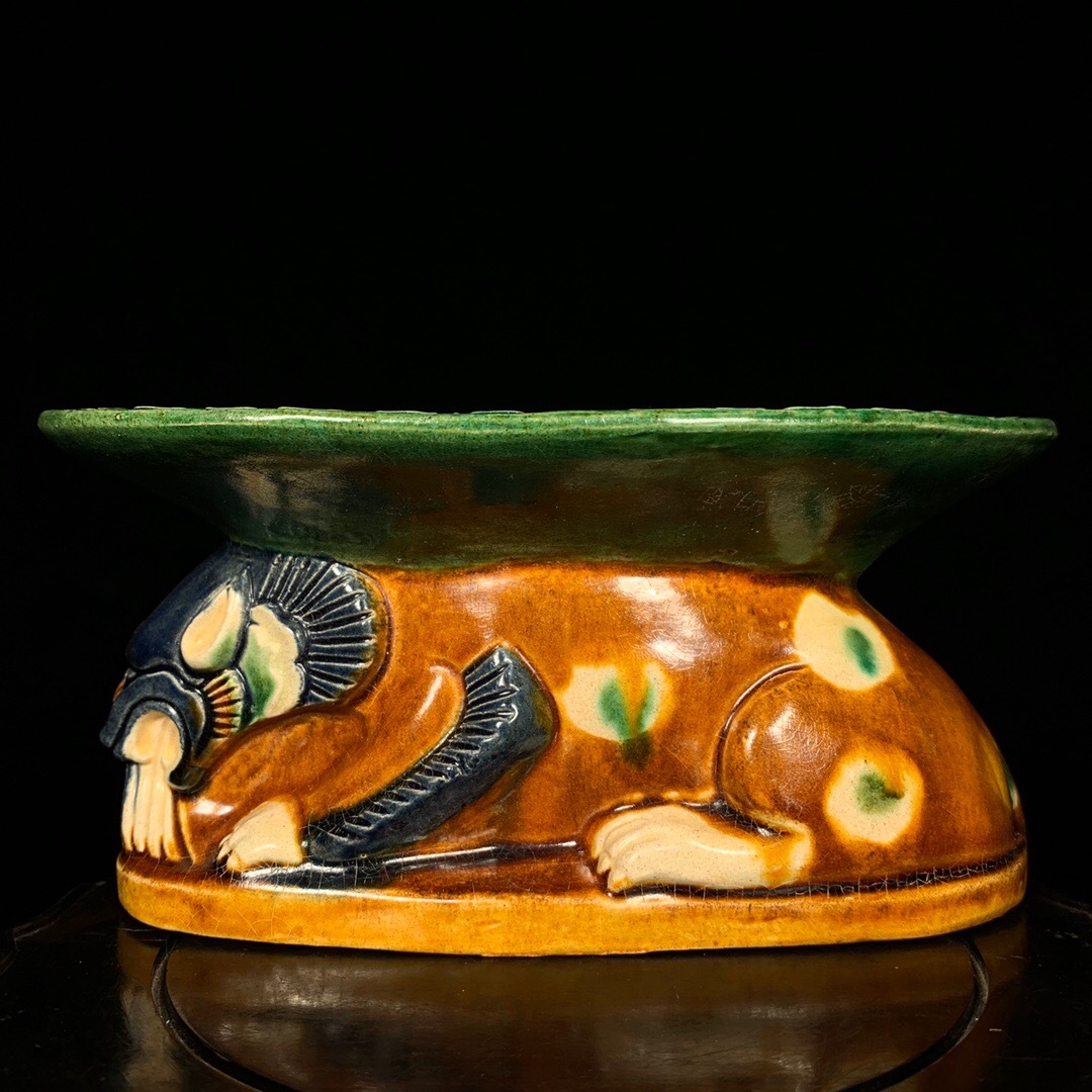 > 蔵友旧蔵出 唐 三彩 花卉紋 獅形枕頭 稀少珍品 貴重品 古陶瓷品 置物 古賞物 中国古玩 中国古美術品