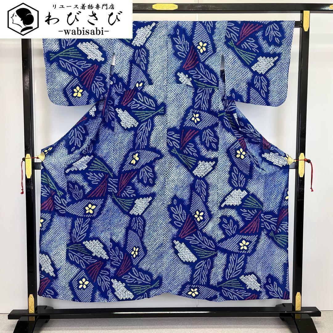 瑠璃色ベースの美しい青味、扇子に花柄模様がデザインされた素敵な柄裄のお品でございます。