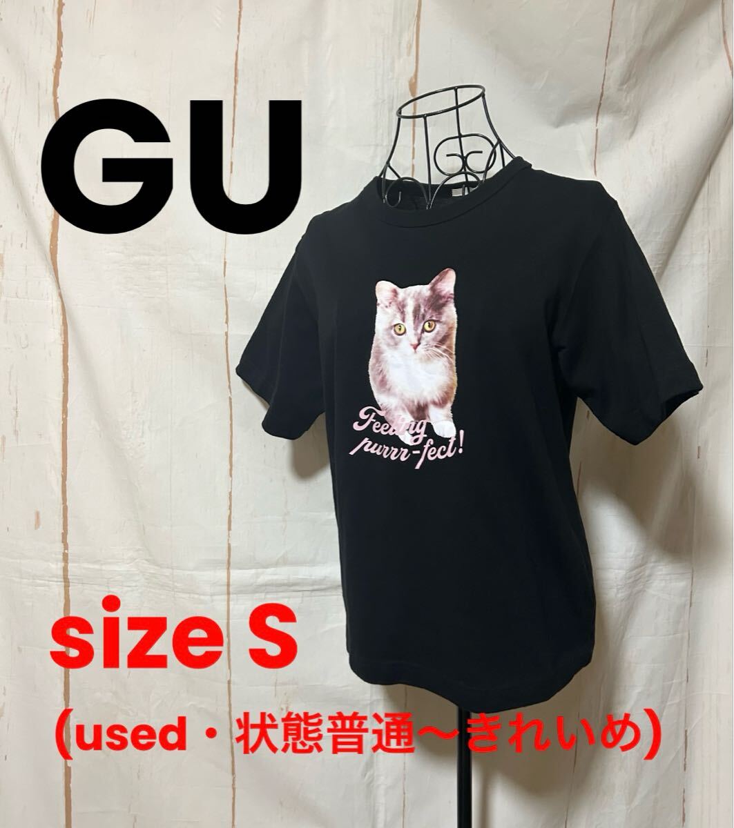 > GU ジーユー 半袖 Tシャツ ティーシャツ プリント ロゴ 猫 キャット(used、状態普通使用感〜きれいめ)Sサイズ、ブラック