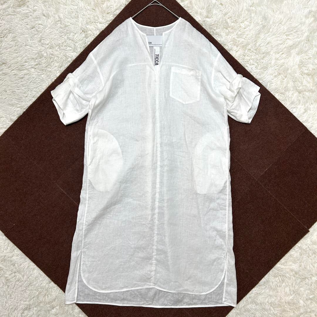 > 希少 極美品 TICCA ティッカ リネン 麻 ツイストスリーブワンピース ロング丈 マキシ丈 半袖 ホワイト 白 無地