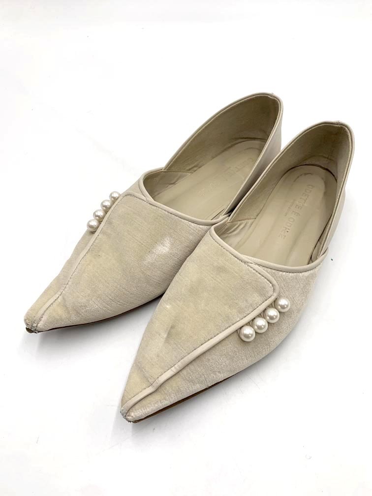 > Odette e Odile オデットエオディール ベルベット ボタンフラップ パール フラット パンプス size24.5/アイボリー ■■