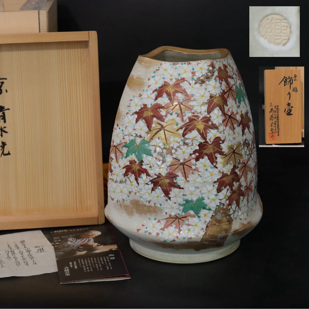 > 清水焼 三代 斎藤雲楽 作 梅花紋 金彩 大花瓶 高約33cm 共箱 ・ 札付き / 京焼 花器 壺 煎茶道具 .B744