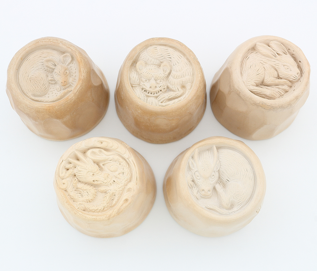 - 【梟】時代 白泥 茶杯 5客 徳衛門造 十二支 干支 子丑寅卯辰 汲み出し 煎茶碗 煎茶道具 酒器 ぐい呑み 萬古焼 万古焼 二六焼 水月焼 古玩