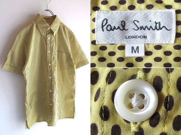 > 美品 90sビンテージ Paul Smith LONDON ポールスミス ロンドン コットン ドット柄 ボックスシルエット 半袖 BDシャツ M 黄茶 日本製 全紳連