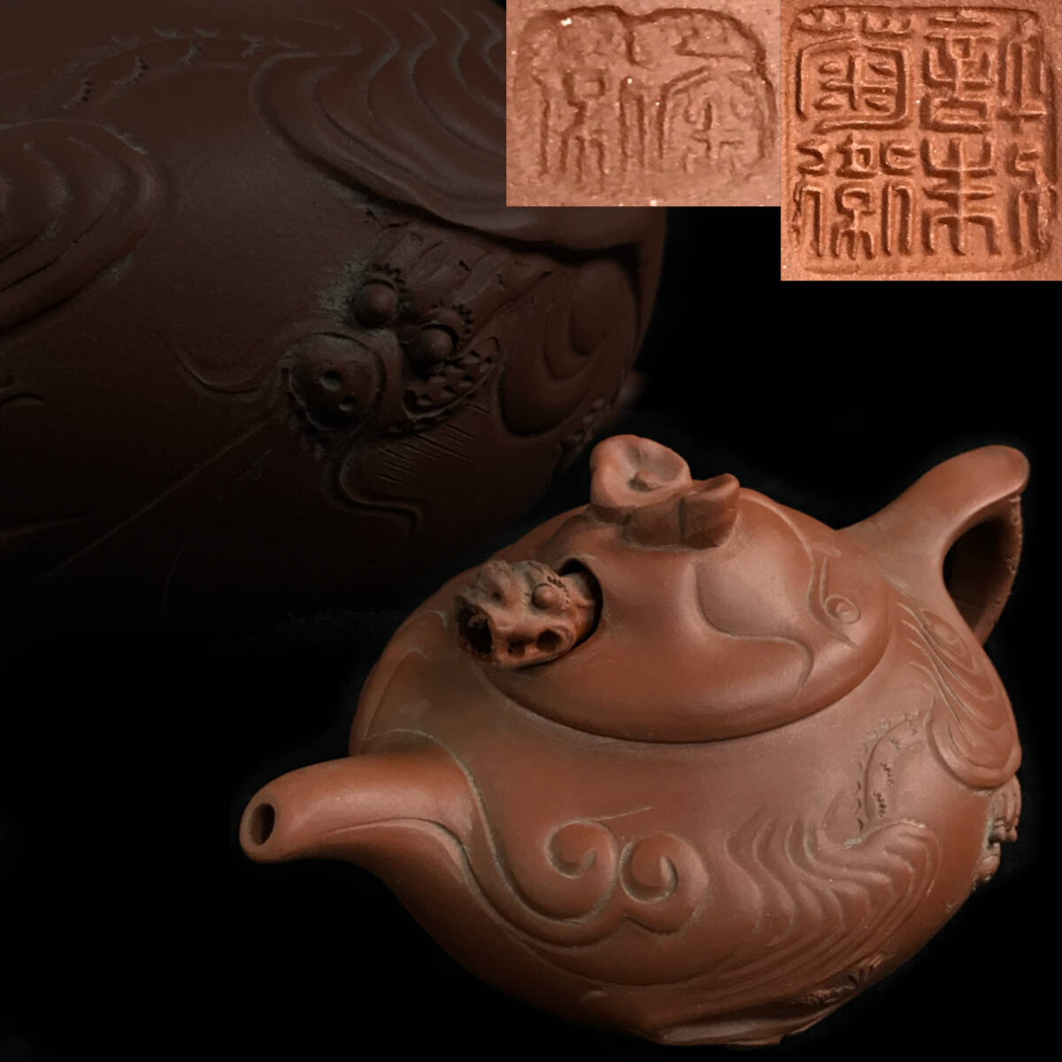- FNY28/85 唐物 煎茶道具 中国茶急須 在銘 陶器茶壺 宜興紫砂 紫泥壺 魚化龍倣古 陶器 急須 きゅうす 骨董 朱泥 アンティーク