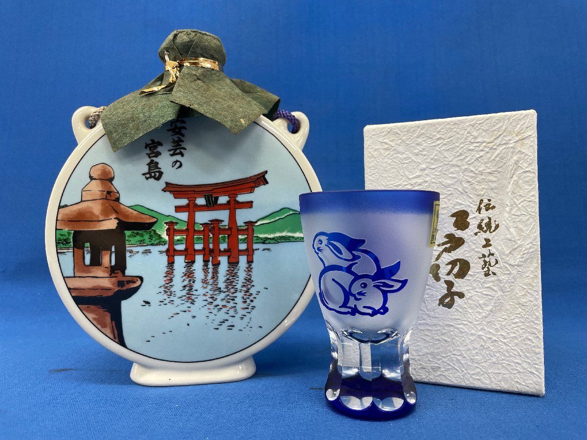- 【古酒】未開栓 希少 当時物「安芸の宮島」清酒 56年7月 昭和 レトロ 厳島 世界遺産/伝統工芸 江戸切子 干支 馬上杯 卯 酒器 セット