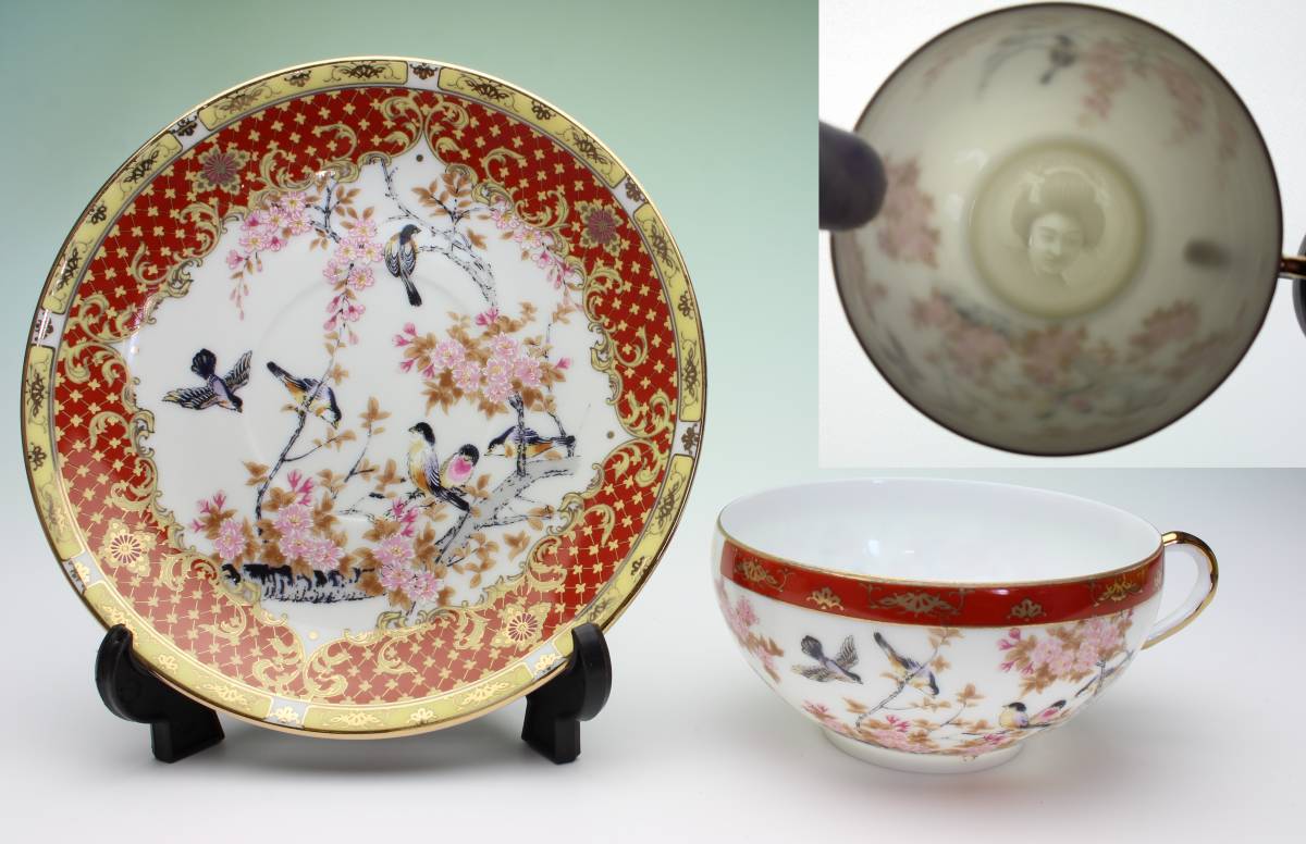 - 透かし芸者 磁器カップ&ソーサー 桜鳥赤 ひとり芸者 燕 クリムゾンレッド 雀 新品 日本製 中椀 小サイズ エッグシェル 花柄 転写絵付 芸妓