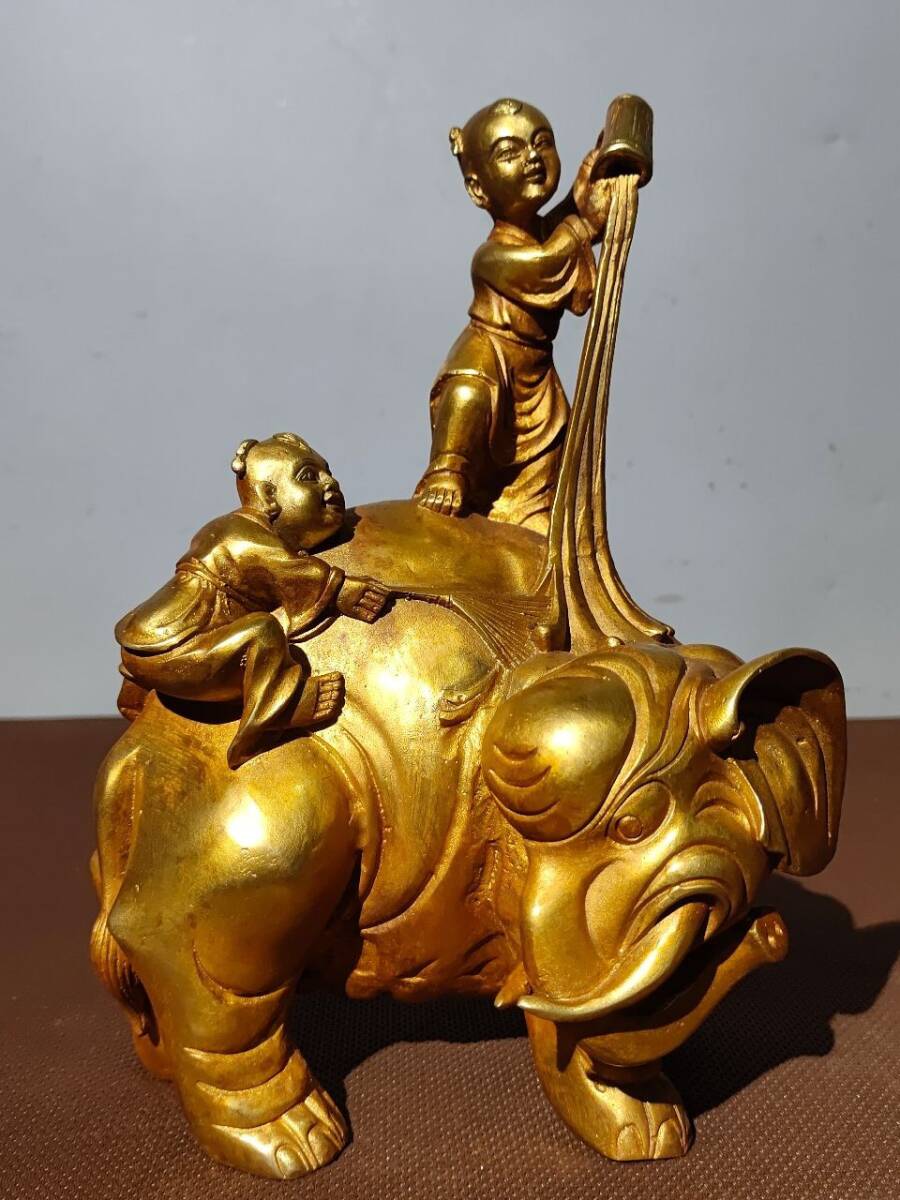 - 蔵友旧蔵出 銅製 塗金 吉祥如意 童子洗象像 希少珍品 貴重品 置物 古賞物 密宗密教 供養品 仏教美術品