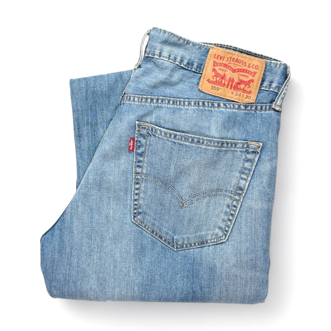 - 【送料無料】リーバイス 559 太めデニム 雰囲気◎ リラックスストレート ヒゲ ライトブルー ストレッチ ジーンズ W36相当 古着 @EA9192