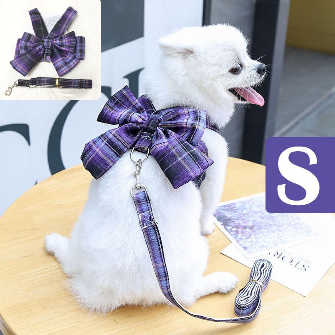 - チェック柄 リボン ハーネス&リードセット 犬服 パープル 【S】