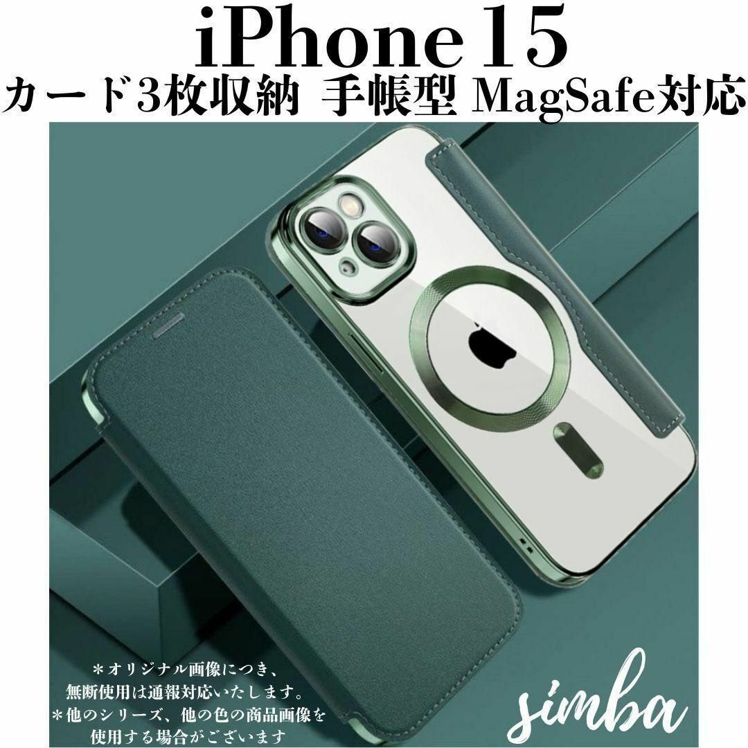 - iPhone 15 ケース 手帳型 MagSafe対応 カード収納付き グリーン