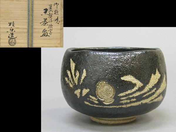 - 【心庵】伊東桂楽 御題「晴」慶入熨斗絵/黒茶碗 共箱 共布 茶道具 A838