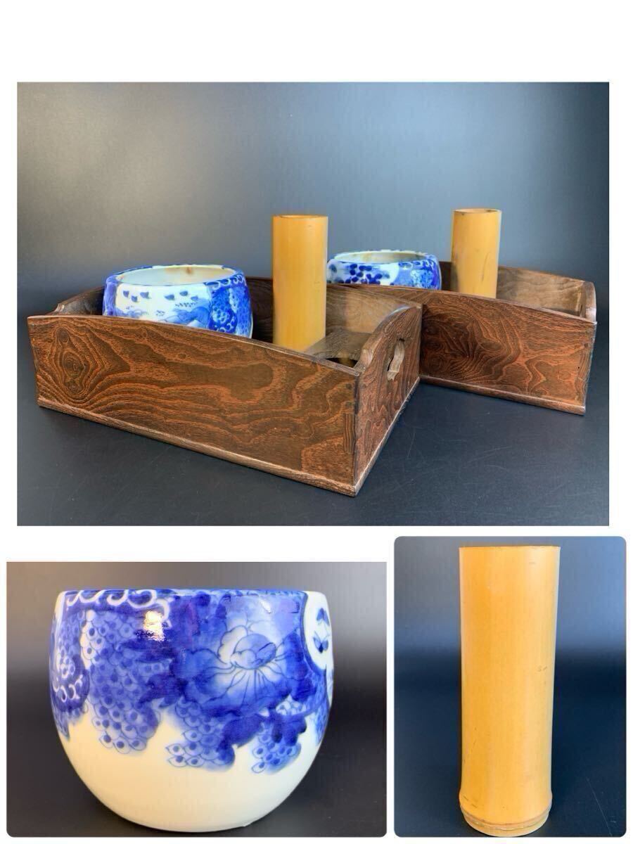 - ★灰付き★煙草盆 染付 灰吹き 盆器台 灰皿 木製 現状 作者不明 昭和レトロ アンティーク 2点 まとめ★53★ee312
