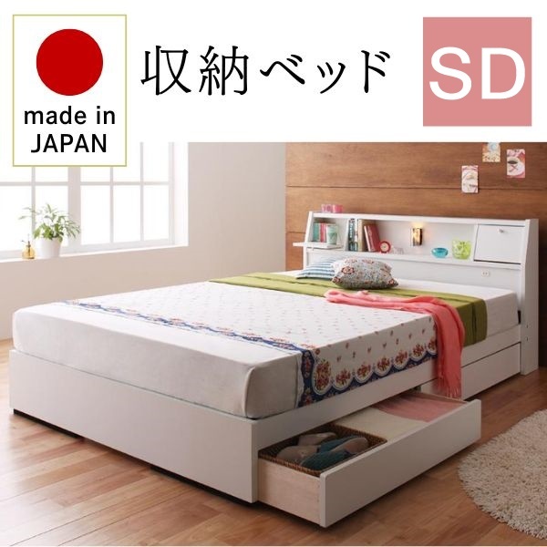 - 照明・コンセント付き収納ベッド Miana ミアーナ ラテックス入り国産ポケットコイルマットレス付き セミダブル ホワイト