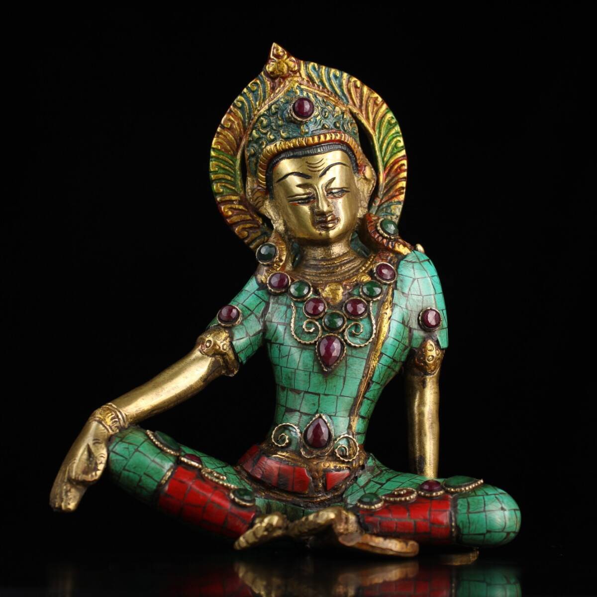 - 蔵友旧蔵出 銅製 寶石嵌 彩繪 描金 藏傳自在度母像 希少珍品 貴重品 置物 古賞物 密宗密教 供養品 仏教美術品
