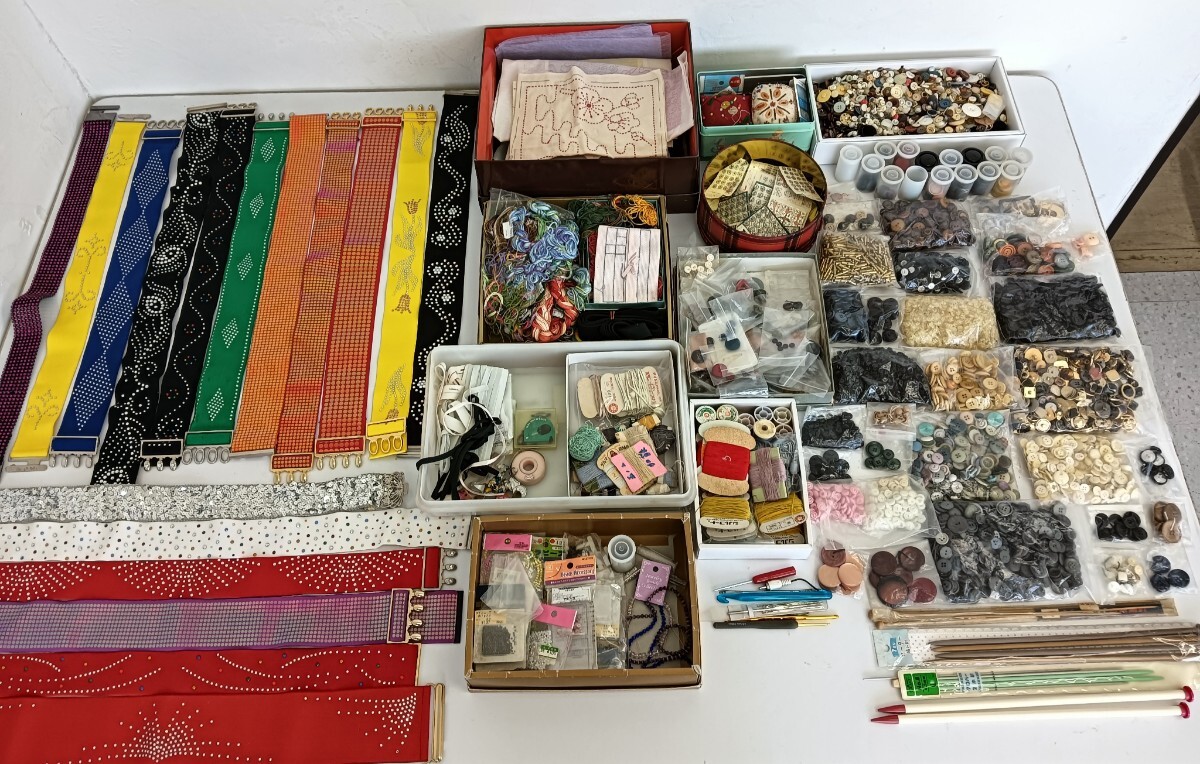 - 【25*70211】◆昭和レトロ◆手芸用品◆編み棒/刺針/刺糸/グラスビーズ/布/ベルト/飾りボタン大量その他いろいろおまとめ売り