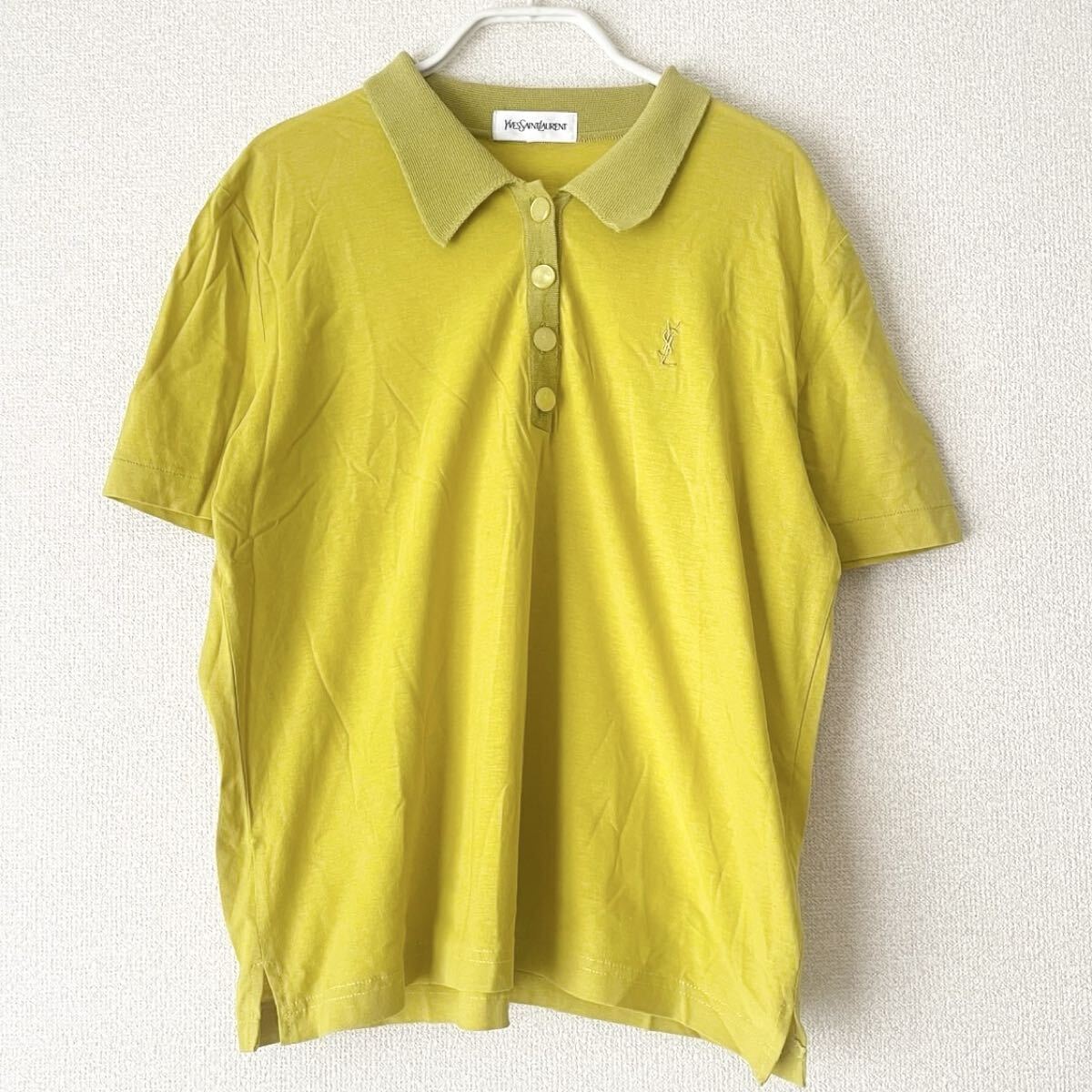 > イヴサンローラン ポロシャツ★イエロー ライトグリーン 美品 上品 セレブ 半袖 レディース L YSL 高級感 麻 リネン 刺繍 ロゴ 胸 シンプル