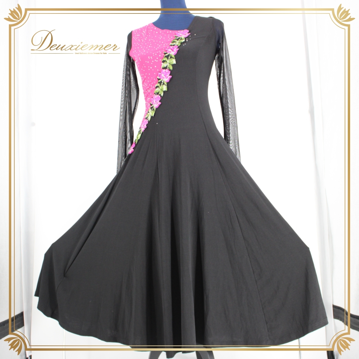- 社交ダンス 衣装 ドレス スタンダード ワンピース ブラック系 ピンク系 黒 ラインストーン 長袖 ICHIOKU イチオク