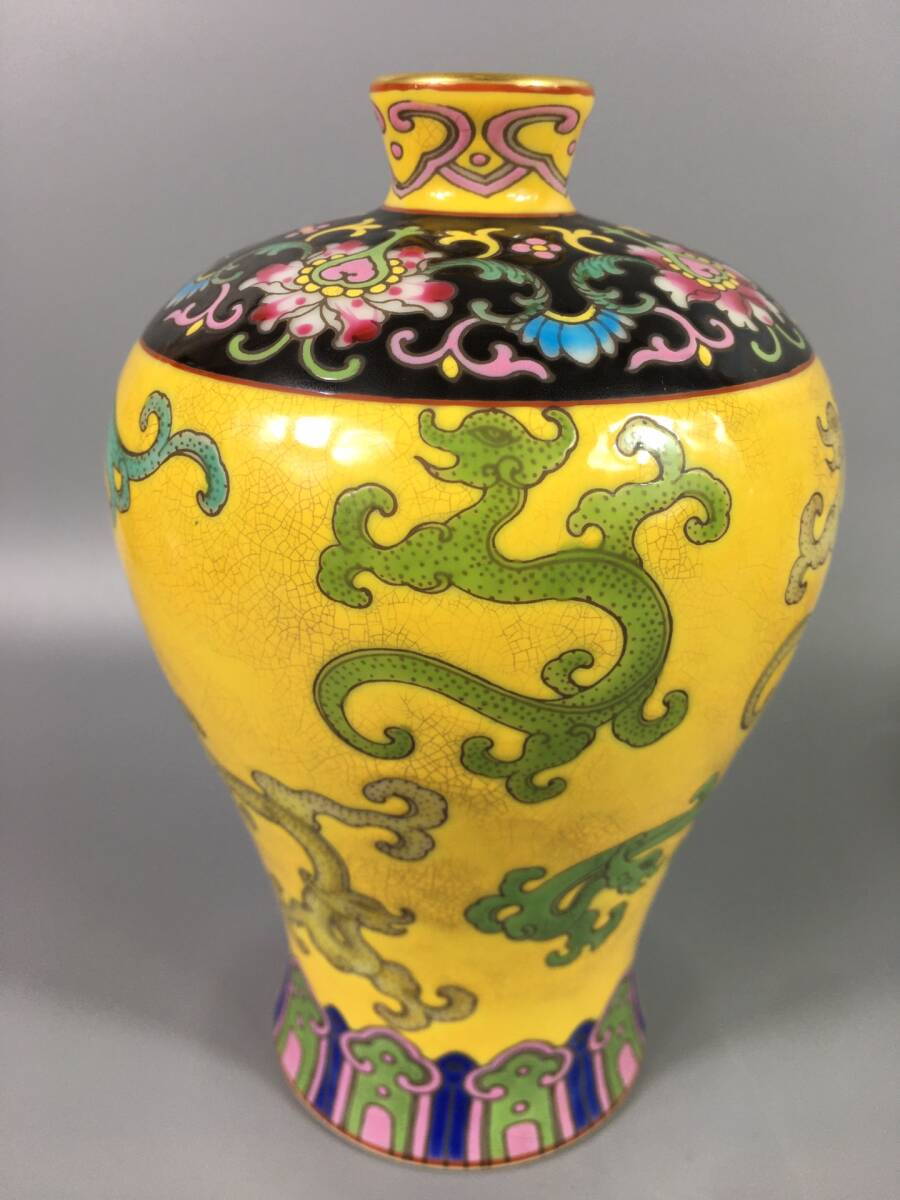 - TM7#5804【3.1】中国骨董 人間国宝 磁器【清乾隆款黄地粉彩竜紋蒔金口瓶】工芸品 施釉陶 青花磁 陶芸 精美彫 置物 收藏品