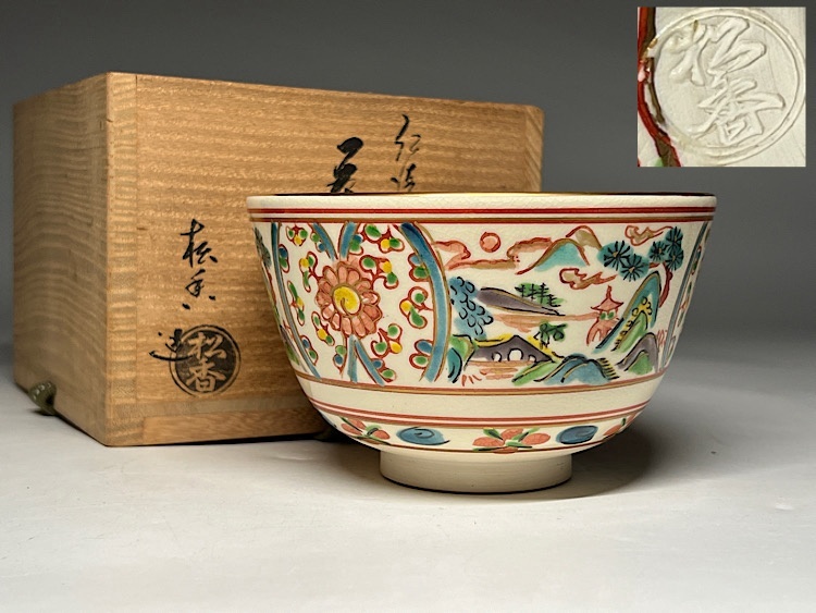- 【瑞】加藤松香作 仁清山水図 茶碗 共箱 共布