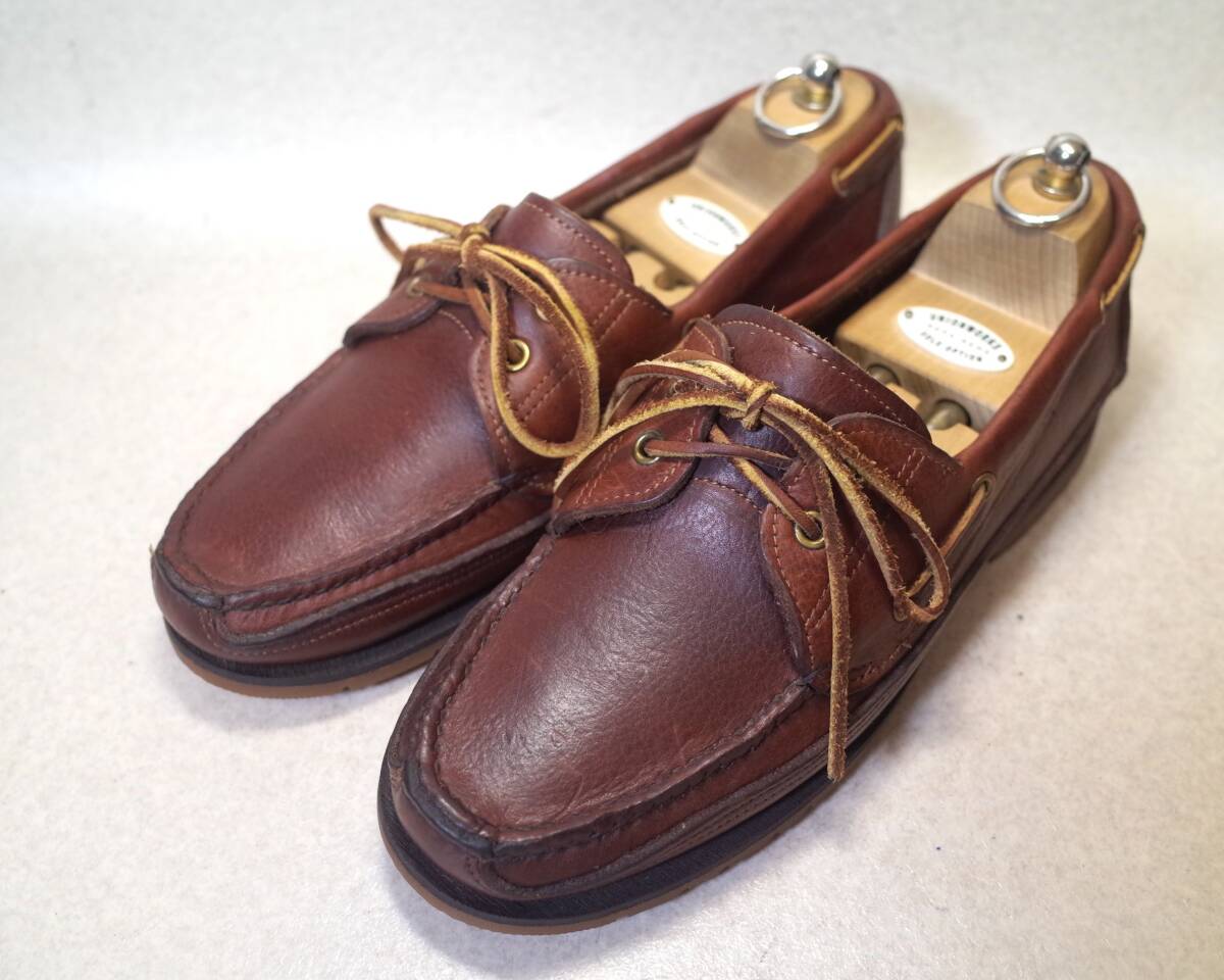 ・デッキシューズ、モカシン、ワークブーツなどに使用されているレザー製シューレース(革製靴ひも)は、雨の日や水場での着用で硬化したり、革やせ、経年による劣化などにより、切れやすくなります。特性を予めご理解いただいた上で、日頃のケアならびにメンテナンス、シューズ本体含め破損時の修理&交換などは落札者様にてお願いします。