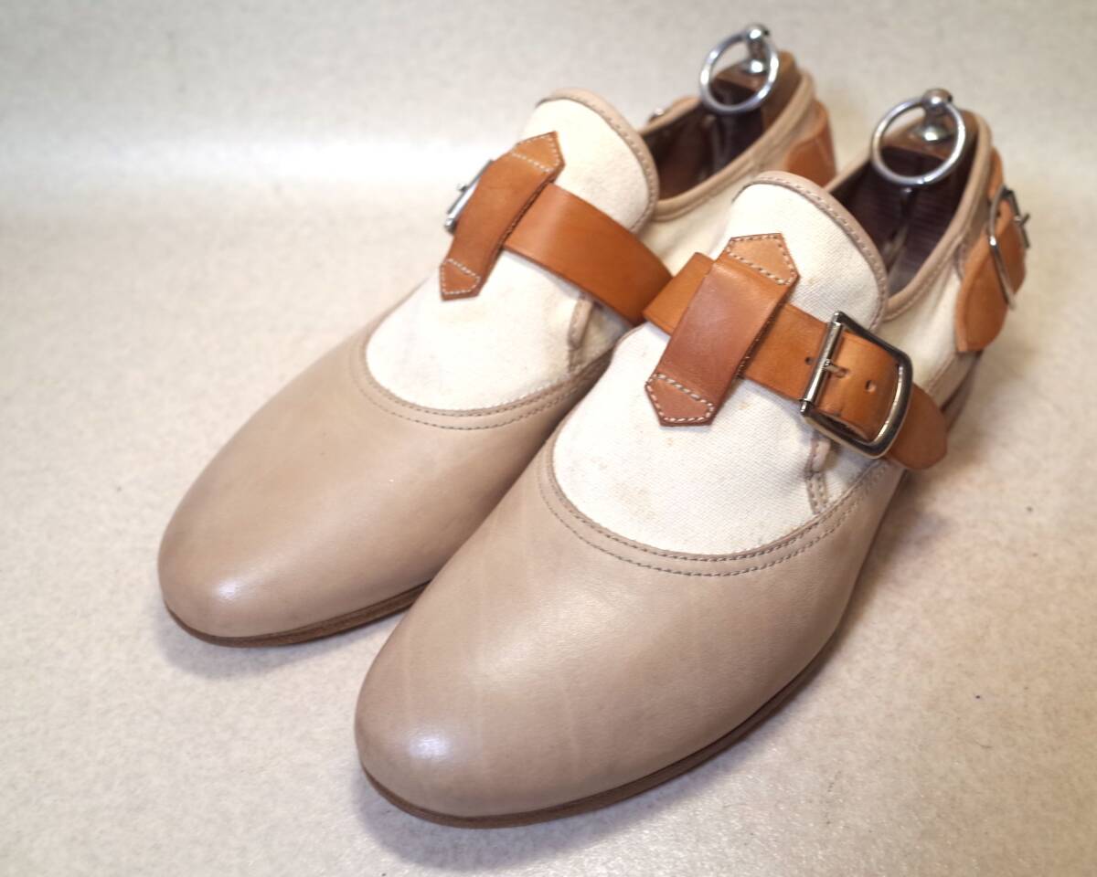 レザー×キャンバスアッパー 2トーンコンビ ベルト&バックルストラップシューズ。