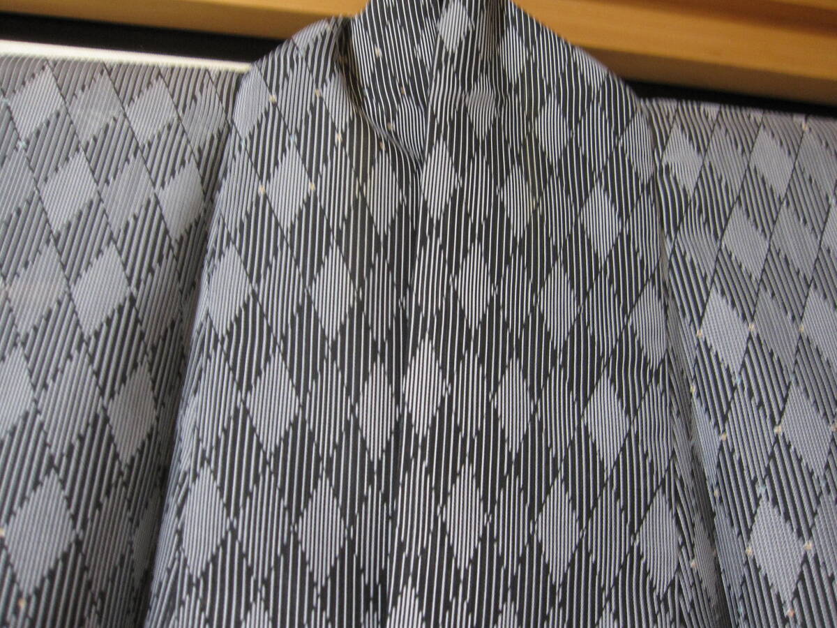 > 夏物 絽 小紋 ポリエステル 美品 プレタMサイズ 裄66 黒地にダイヤ柄 6月から9月まで着用可能 シックな装い 名古屋帯